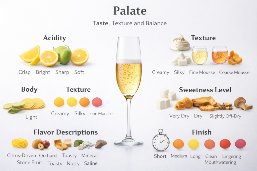 Take a small sip and allow the Champagne to move across the mouth. Focus on both flavor and structure.
