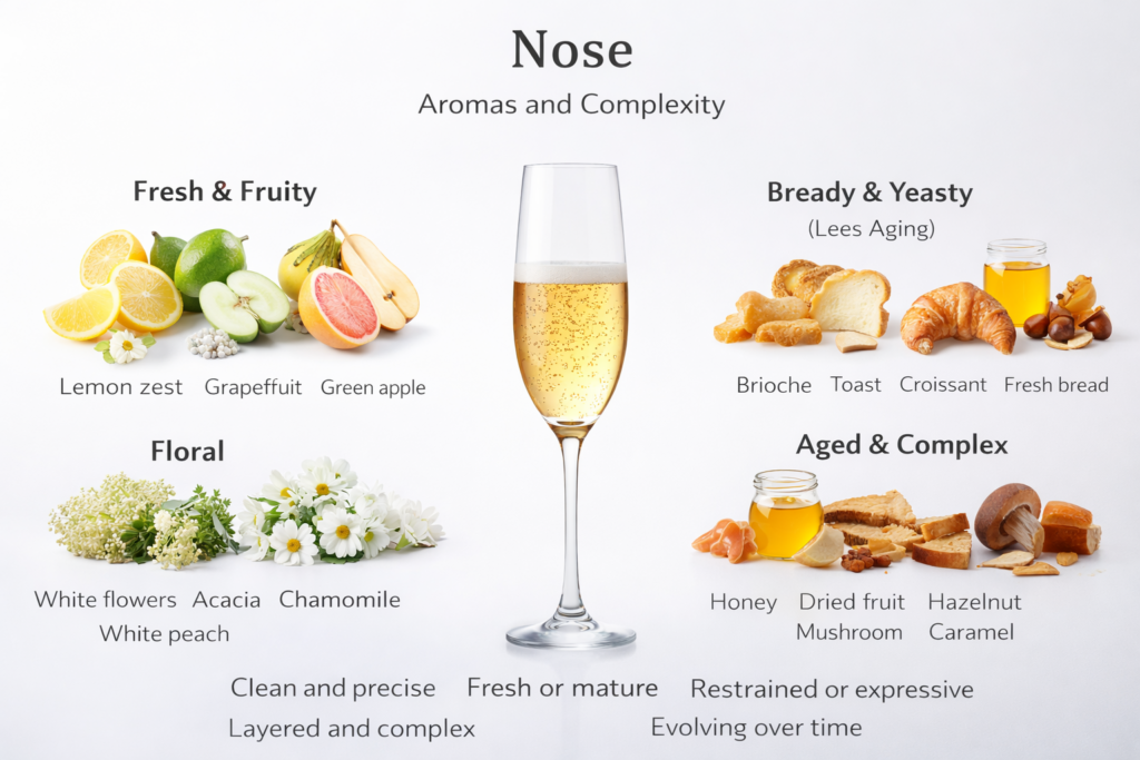 Gently swirl the glass and smell first lightly, then more deeply. Quality Champagne often develops additional aromas as it opens in the glass.